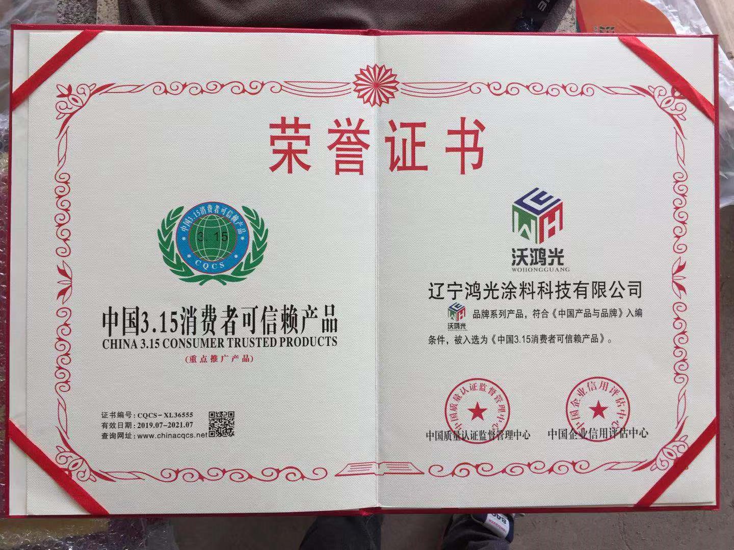 沃鴻光無機涂料被評為中國3.15消費者可信賴產品